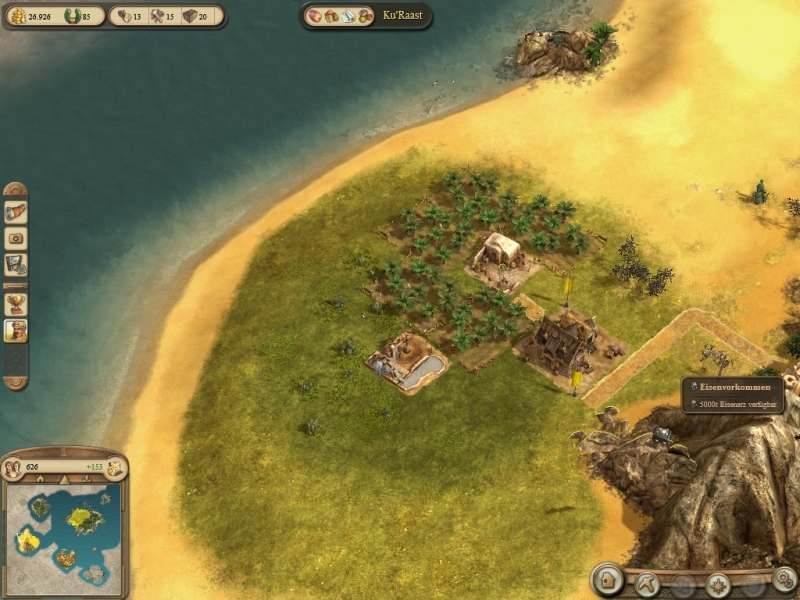 Nach der Rettung des zweiten Kindes rät uns der Großwesir den Karawanenführer Karim im Westen aufzusuchen. Wir fahren mit dem neuen Schiff und der Ladung zu der markierten Stelle und bauen bauen einen Kontor auf der Insel. Um die Straße zur Karawanserei bauen zu können benötigen wir noch ein Markthaus (zu weit weg von der Küste).