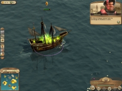 Das besagte Schiff verliert durch den Fluch in regelmäßigen Abständen 200 Trefferpunkte. Wir bräuchten also nur folgen und warten, bis es sinkt. Ein paar Salven können wir mit unserem Flaggschiff aber abgeben. Wäre ja sonst langweilig.